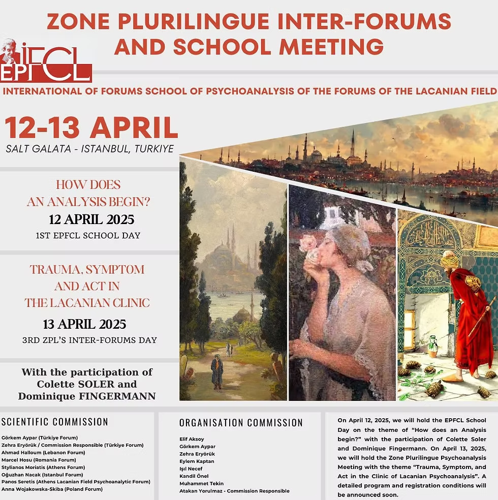 | 12 Απριλίου 2025 1η Ημερίδα Σχολής Πώς ξεκινά μια ψυχανάλυση; | 13 Απριλίου 2025 3η Συνάντηση των Φόρουμ της Πολύγλωσσης ζώνης Τραύμα, σύμπτωμα και πράξη στη λακανική κλινική στην ψυχανάλυση |
