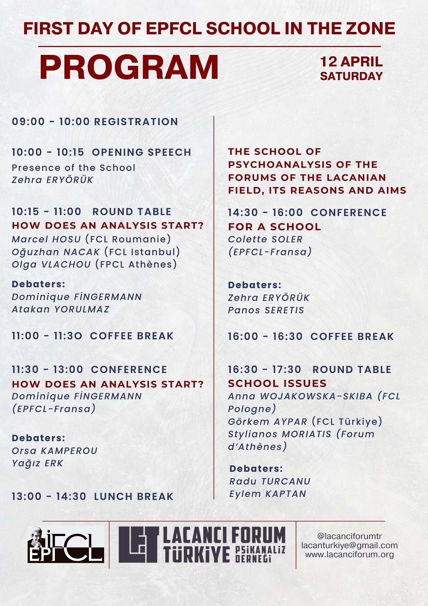 Η 12η Απριλίου θα είναι η πρώτη Ημερίδα Σχολής εντός της Ζώνης και το θέμα της θα είναι «Πώς ξεκινά μια ψυχανάλυση;». Στις 13 Απριλίου το θέμα θα είναι «Τραύμα, σύμπτωμα και πράξη στη λακανική κλινική».