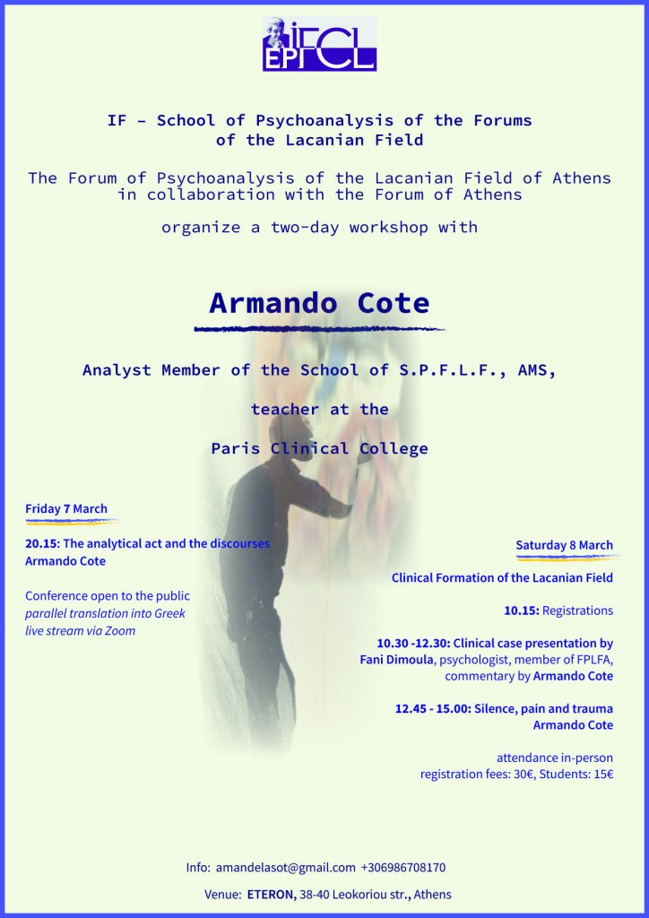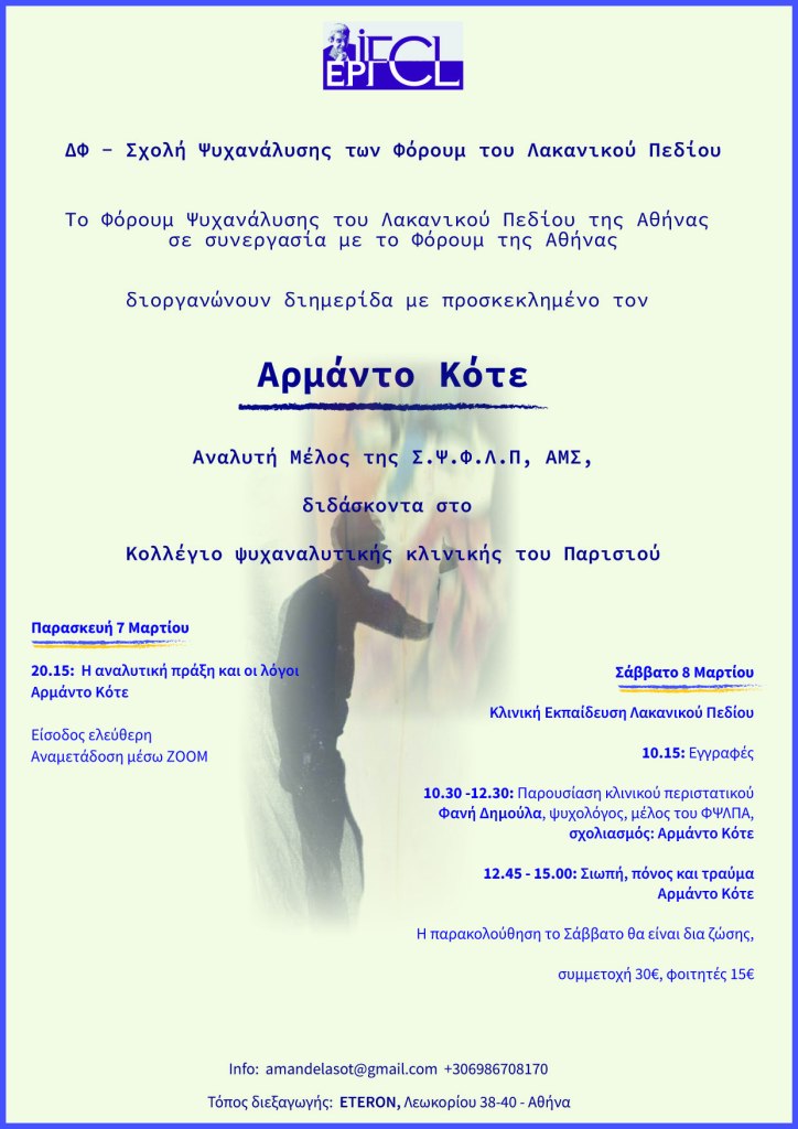 Το Φόρουμ Ψυχανάλυσης του Λακανικού Πεδίου της Αθήνας σε συνεργασία με το Φόρουμ της Αθήνας διοργανώνουν διημερίδα με προσκεκλημένο τον