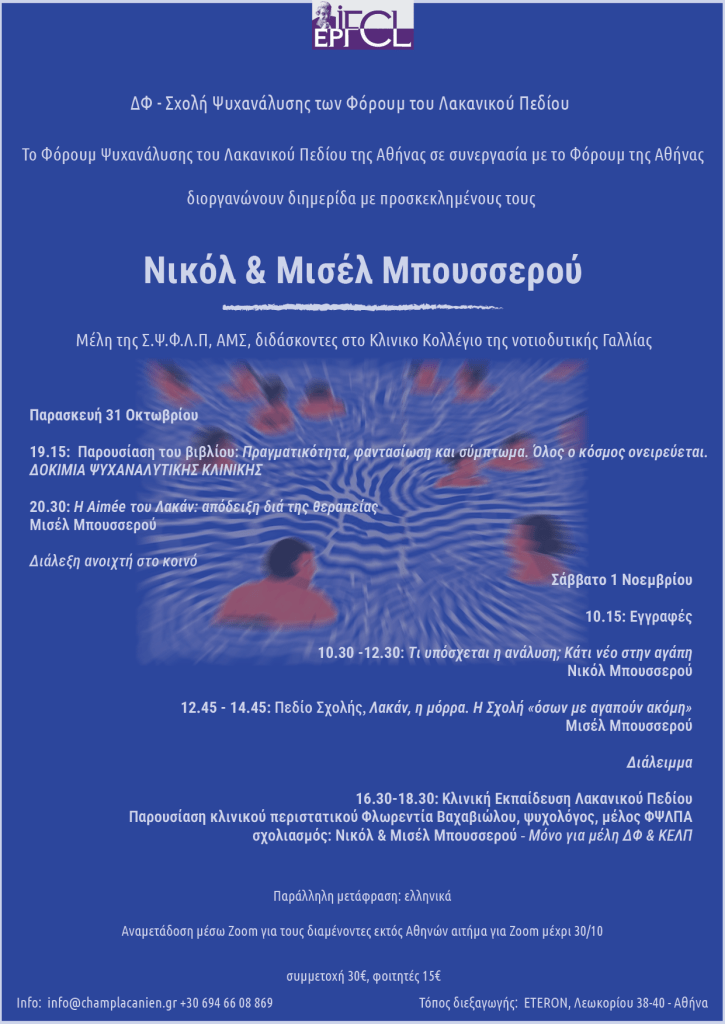 | 12.45 – 14.45 | ΠΕΔΙΟ ΣΧΟΛΗΣ Λακάν, η μόρρα. Η Σχολή «όσων με αγαπούν ακόμη» Από τον Μισέλ Μπουσερού |