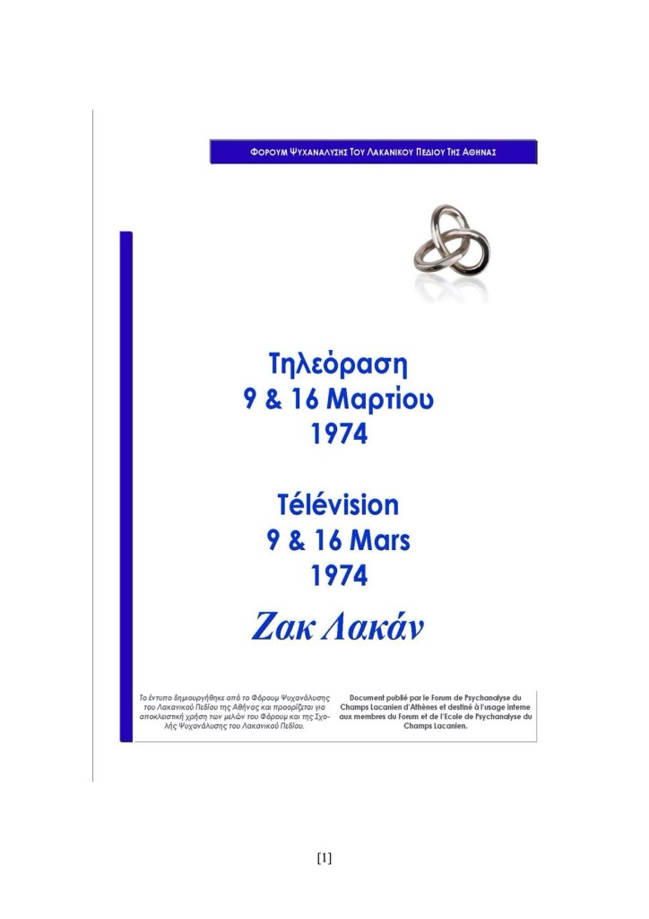 Πρωτότυπο γαλλικό κείμενο από τον ιστότοπο staferla (http://staferla.free.fr/Lacan/television.htm) με την καθοδήγηση της μαγνητοσκοπημένης συνέντευξης του Ζακ Λακάν στη γαλλική τηλεόραση το 1974 (https://www.youtube.com/watch?v=kpyac3luL5E)